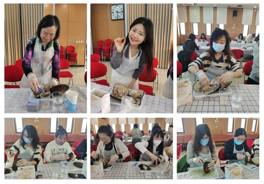 在专业人员讲解了珍珠的相关知识和开蚌流程后,女职工们满怀好奇打开蚌壳,在专业人员的指导下小心翼翼地开启了自己的开蚌寻宝之旅。大家沉浸在开蚌取珍珠的新奇体验中,并挑选最喜爱的珍珠搭配合适的饰品模具,经过专业人员的镶嵌,最终收获了自己的专属饰品。活动现场洋溢着大家的幸福和喜悦,很多女同胞第二天就佩戴上本次活动制作的饰品,幸福感油然而生。活动为大家平日繁重的科研工作增添了一丝乐趣和一抹亮色,为接下来的科研工作提供了“能量”和“养分”。