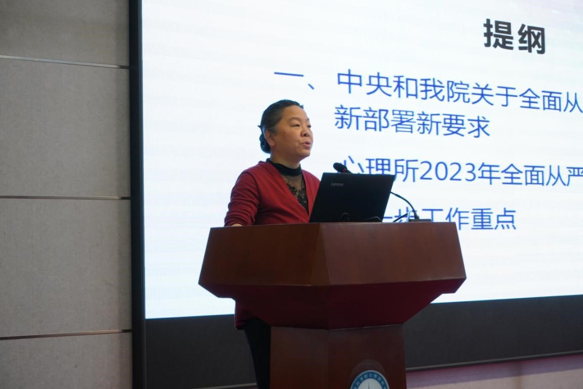 党委书记孙向红以“持之以恒全面从严治党,以高质量党建推进研究所高质量发展”为题作报告,深刻阐述了党中央和院党组关于坚定不移全面从严治党,深入推进新时代党的建设新的伟大工程的部署和安排,介绍了心理所一年来坚持党对科技事业的全面领导,贯彻落实全面从严治党战略方针的系列工作和成效,并提出了下一步的工作重点。她强调,要进一步加强党对科技工作的全面领导,扎实推进党的建设各项重点工作,以更高标准、更高要求促进党建工作与科技创新中心工作深度融合,大力弘扬科学家精神,压紧压实全面从严治党责任,不断提高党的建设质量,为抢占科技制高点提供坚强政治保证和强大精神动力。