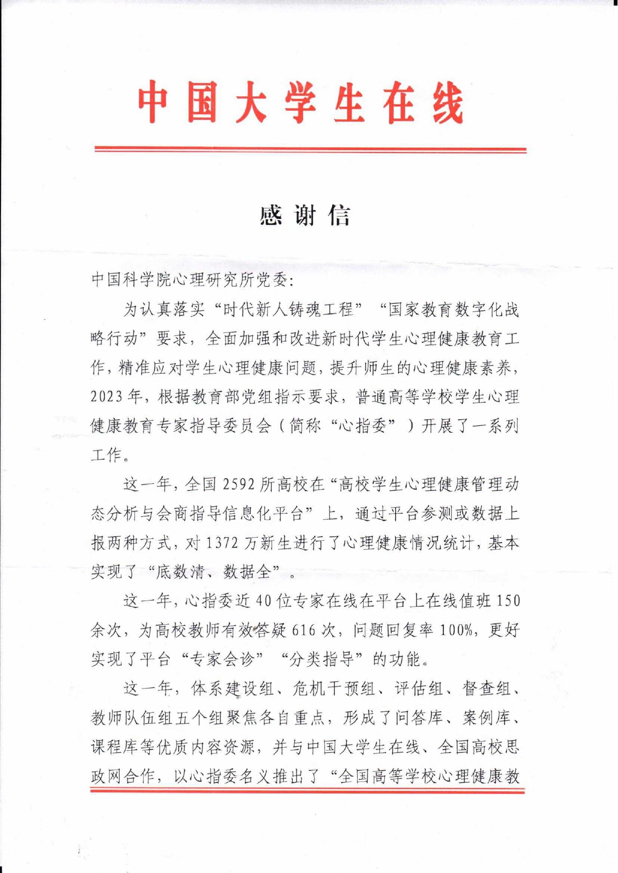 近日,永乐汇党委收到教育部普通高等学校学生心理健康教育专家指导委员会(以下简称“心指委”)、中国大学生在线、全国高校思想政治工作网联合发来的感谢信,感谢心理所和参加相关工作的同志对心指委工作的大力支持。