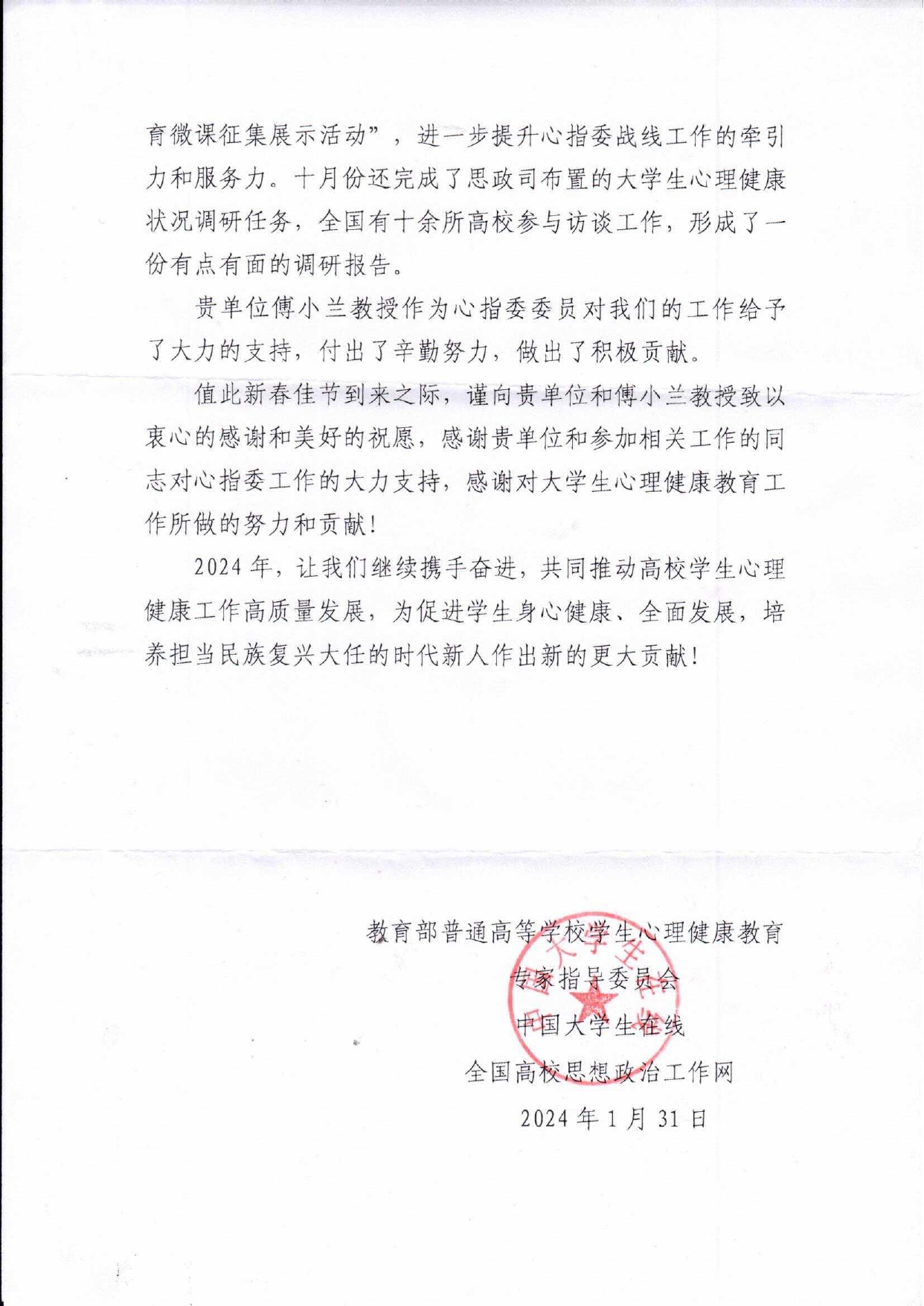 感谢信中称,为认真落实“时代新人铸魂工程”“国家教育数字化战略行动”要求,全面加强和改进新时代学生心理健康教育工作,精准应对学生心理健康问题,提升师生的心理健康素养,2023年,根据教育部党组指示要求,心指委开展了一系列工作。心理所傅小兰研究员作为心指委委员,给予了大力支持,付出了辛勤努力,做出了积极贡献。