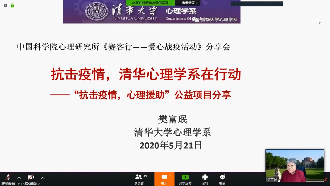 5月21日下午,认知与发展心理学研究室党支部在线上举办了永乐汇第十三期“赛客行”沙龙,并通过网络平台直播,共有220余人在线参加。本次沙龙主题为“爱心战疫——心理学家在行动”,邀请了心理所副所长陈雪峰、清华大学心理学系教授樊富珉、中国人民大学心理学系主任胡平、北京师范大学心理学部教授蔺秀云、北京大学心理与认知科学学院副院长刘兴华和华中师范大学心理学院教授佐斌与会交流。会议由支部书记严超赣主持,心理所所长傅小兰致辞。