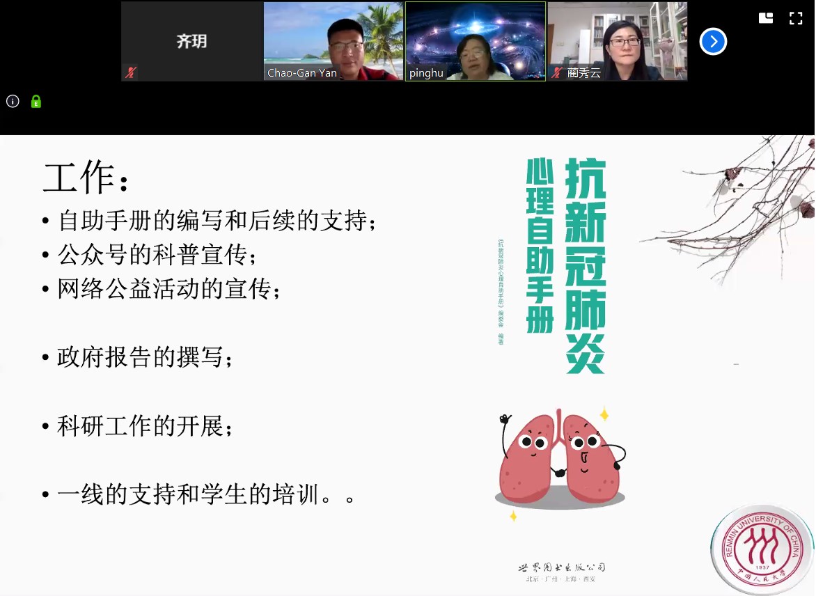 中国人民大学心理学系主任胡平分享了中国人民大学心理系的工作服务经验。疫情开始,心理系组织团队开展了大数据舆情追踪,记录网民情绪心态变化,关注网络教育对家长的影响等相关工作,并迅速反应,编写了《抗新冠肺炎心理自助手册》,将《手册》送到各个药店,供大家免费获取。人大心理系立足自身特色,围绕社会管理、经济信息、复工复产的焦虑、舆情引导撰写相关报告,支撑政府决策,并针对中小学、职场等特定人群展开科普宣传。胡平强调,中国文化下独有的应对方式,让抗疫工作也有独特的优势,但仍需积累更多本土化的工作经验,让心理学更好地服务公共政策的制定。