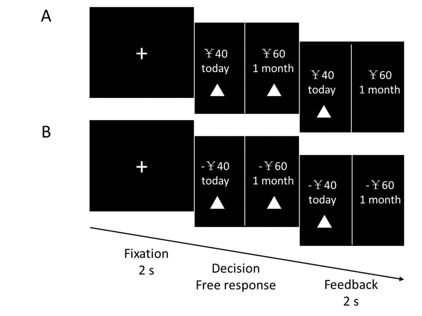图1:获得跨期决策任务(A)和损失跨期决策任务(B)示例