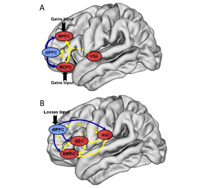 中国科学院行为科学重点实验室李纾研究组与中国科学院自动化所蒋田仔课题组于2009年首次报告了跨期决策中获得-损失不对称效应的脑影像证据,但是决策相关脑区之间的协同活动是否也存在获得-损失不对称效应,目前学界尚缺少相关研究。