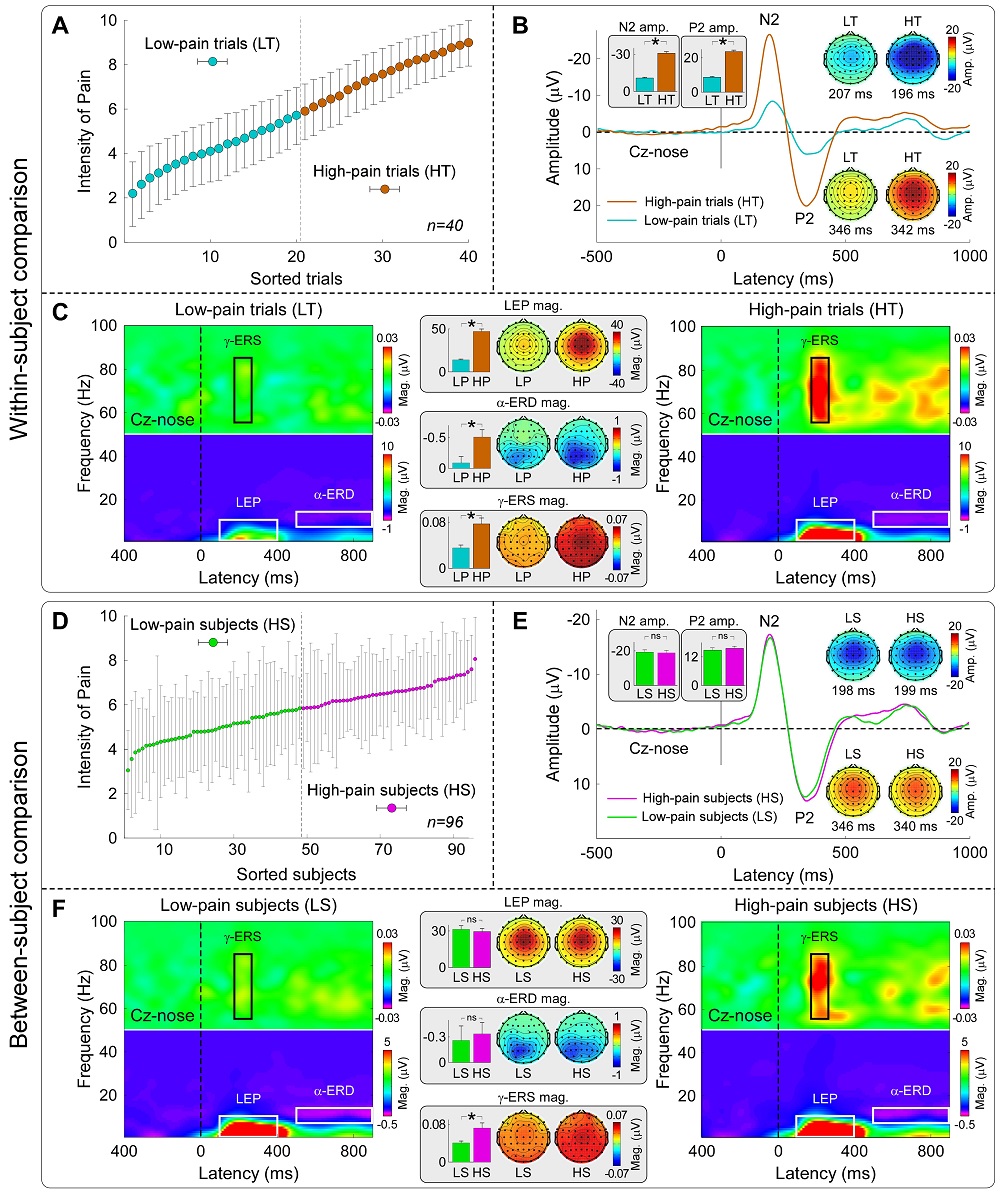 整个研究由3个不同的实验组成。实验1首先招募了96名志愿者(51名女性,年龄21.6 ± 1.7岁),记录他们在接受不同强度激光热痛刺激时的疼痛评分及脑电(EEG)数据。为分离疼痛敏感性的个体内差异和个体间差异,研究者将数据分成两个不同的层次,一是由单个个体对不同疼痛刺激的所有行为评分和脑电响应组成的个体内数据,二是将个体对不同疼痛刺激的行为评分和脑电响应平均后得到的个体间数据。这两个层次分别对应了个体内差异和个体间差异。