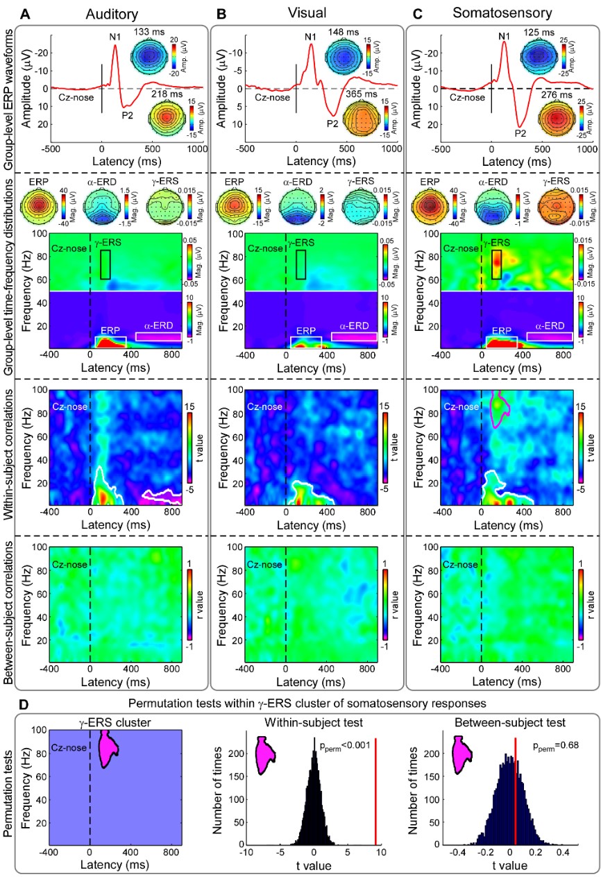 正因如此,疼痛领域多年来一直致力于研究能够刻画个体疼痛敏感性差异的神经标记物。然而,以往的研究常常混淆同一个体对不同强度疼痛的感受差异(个体内差异)和不同个体对同一强度疼痛的感受差异(个体间差异),而且研究结果也存在诸多不一致之处。针对这些问题,中国科学院心理健康重点实验室胡理研究员与伦敦大学学院Giandomenico Iannetti教授合作,采用跨物种研究方法,结合心理物理学测量和电生理技术,发现了高频γ振荡信号能可靠且特异地预测个体疼痛敏感性。研究成果已于1月14日在线发表于国际知名期刊美国科学院院刊PNAS[6]。