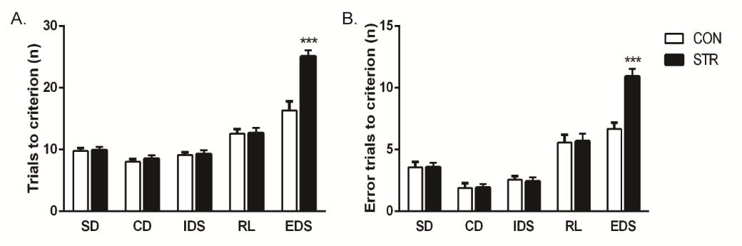 青少期阶段是抑郁症、精神分裂症、成瘾行为等一些常见精神疾病高发和易感的阶段。这一阶段的各种负性社会经历是其发生发展的重要诱发因素。尽管这些疾病表现出各种不同的症状表型,其中前额叶皮质介导的执行功能障碍被认为是共同的主要症状之一。同伴欺侮是青少群体常见的社会应激源。利用 “居留者-入侵者”社会挫败模型诱发啮齿类动物类似的应激经历,通过以前的研究发现青少期阶段的应激暴露能够诱导小鼠成年后前额叶皮质介导的认知灵活性明显受损(图1)。认知灵活性是一种随着环境变化对目标导向行为进行相应调整的高级脑功能。这种能力在抑郁症、精神分裂症、创伤后应激障碍等多种精神疾病患者中表现出不同程度的损害,并与疾病预后和药物治疗反应密切相关。