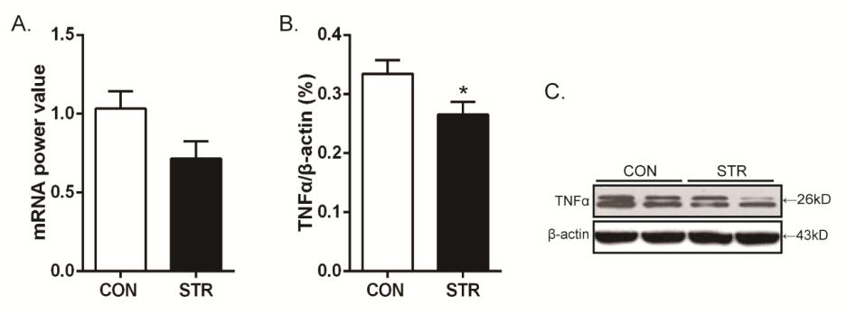 图3 青少期社会应激降低成年小鼠mPFC TNFα mRNA和蛋白水平