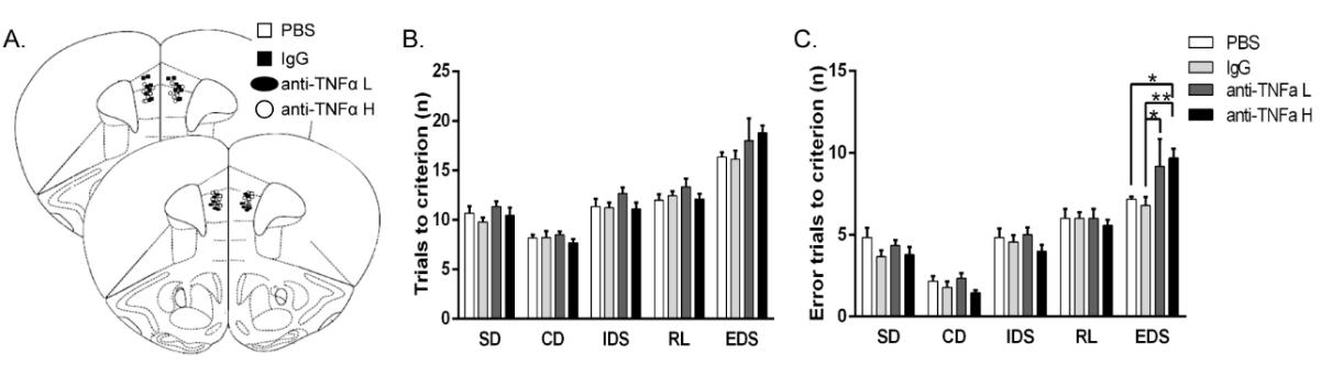 图4 成年健康小鼠mPFC慢性微注射TNFα中和剂选择性损害认知灵活性