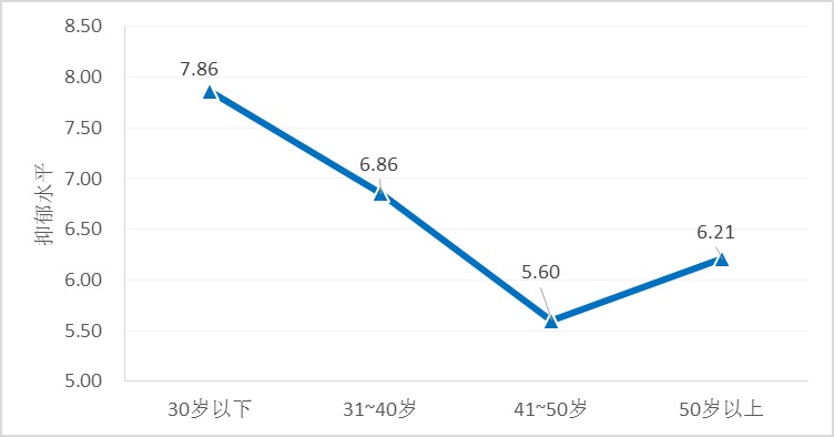 研究结果发现,总体上近三成的调查对象有不同程度的抑郁表现。参加调查的民众中,6.8%的人抑郁分数较高,属于高风险群体,20.7%有一定的抑郁倾向,如不能进行及时和有效的干预和调整有加重成为高风险的可能。30岁以下的年轻人群体抑郁方面得分最高,其次为31-40岁人群,41-50岁中年群体的抑郁水平最低,50岁以上群体的抑郁水平又有所升高。