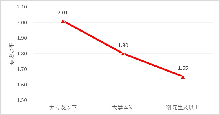 参与本次调查的民众中22.4%的人具有明显的焦虑问题。在焦虑程度上,呈现出青年人得分更高的趋势,但年龄间的焦虑程度差异并没有达到显著水平。同时,不同学历的调查对象焦虑程度存在显著差异,研究生及以上学历人群的焦虑程度要显著低于大专及以下人群。