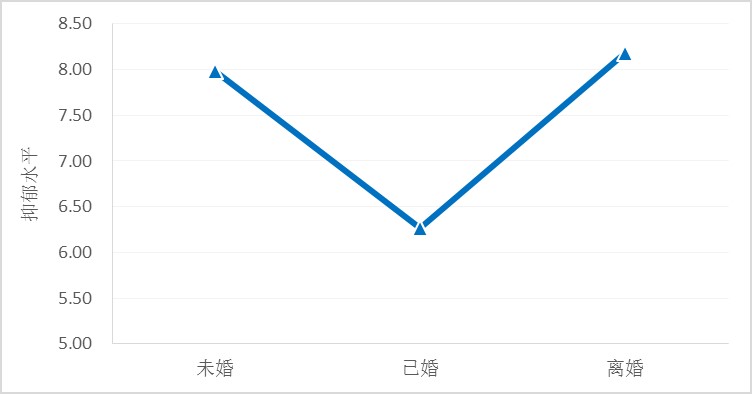 不同婚姻状况民众的抑郁程度呈现显著差异。已婚群体的抑郁程度要显著低于未婚和离异群体。在焦虑程度上无显著差异,已婚人群的焦虑总体得分上略低于未婚和离异人群。