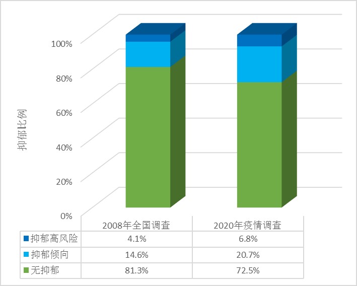 该研究将当前疫情下的国民情绪健康与2008年的全国调查结果进行了比较分析。结果发现,本次调研结果的抑郁平均分高于2008年我国国民的抑郁总得分,有抑郁倾向的群体和高风险群体的占比均高于2008年全国调查的结果。