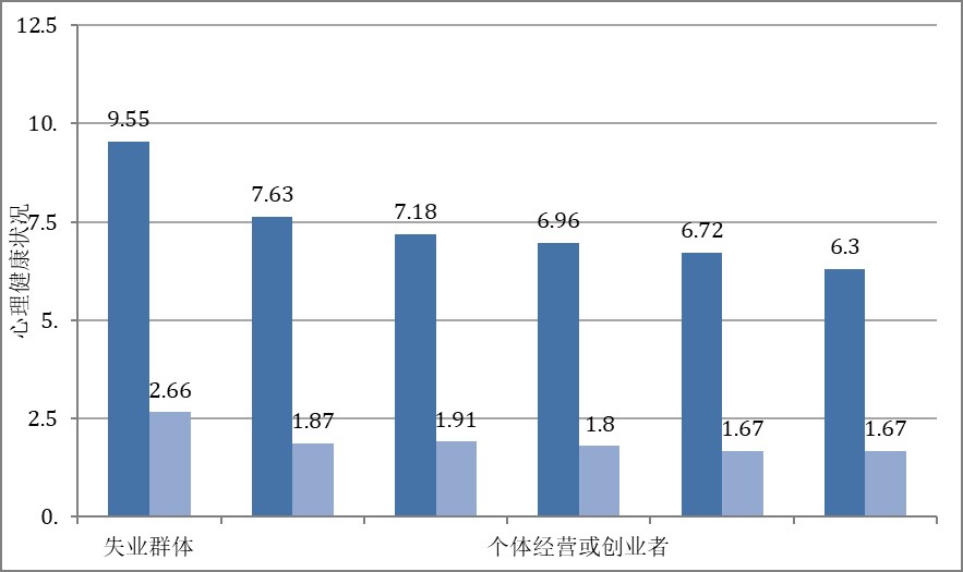 调查结果显示,抑郁和焦虑状况处于最高水平的均是无业待业人员,其次为放假待命人员和在家工作人员,到岗工作人员的抑郁和焦虑水平都是最低的。不同职业群体抑郁和焦虑的情绪健康状况存在显著差异:处于失业状态下群体的抑郁水平最高,其次为私营企业工作人员;接下来是个体经营或创业者与党政机关或事业单位工作人员,国有企业工作人员抑郁水平相对较低。失业状态下群体的焦虑水平也显著高于其他职业类型的群体。