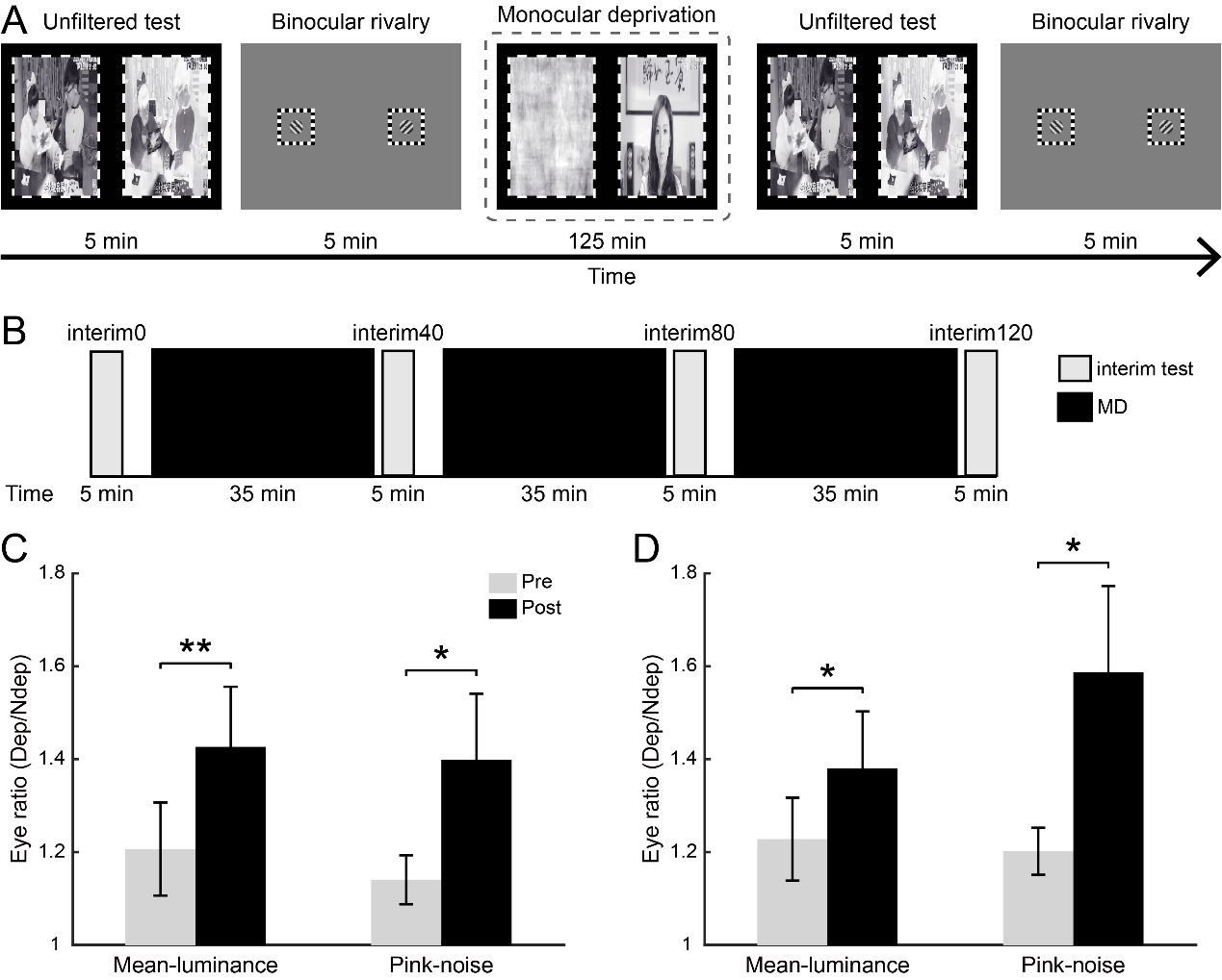 中国科学院行为科学重点实验室鲍敏研究组的科研人员,设计了一种基于自然场景刺激的稳态视觉诱发电位技术(图1A),通过立体镜给左右眼呈现不同频率闪烁(对比度反转)的自然融合刺激进行融合刺激测试(unfiltered test),直接检测单眼剥夺在自然场景下的神经效应。同时,在剥夺过程中,通过进行四组中间测试(interim test),追踪剥夺过程中神经反应的动态变化(图1B)。本研究同时考察了两种单眼剥夺类型:一种是模拟遮盖剥夺(mean-luminance),剥夺过程中非剥夺眼看到的是正常视频图像,剥夺眼看到的是平均亮度画面;另一种是相位规则剥夺(pink-noise),剥夺眼看到的是相位规则被打乱的图像(图1A)。