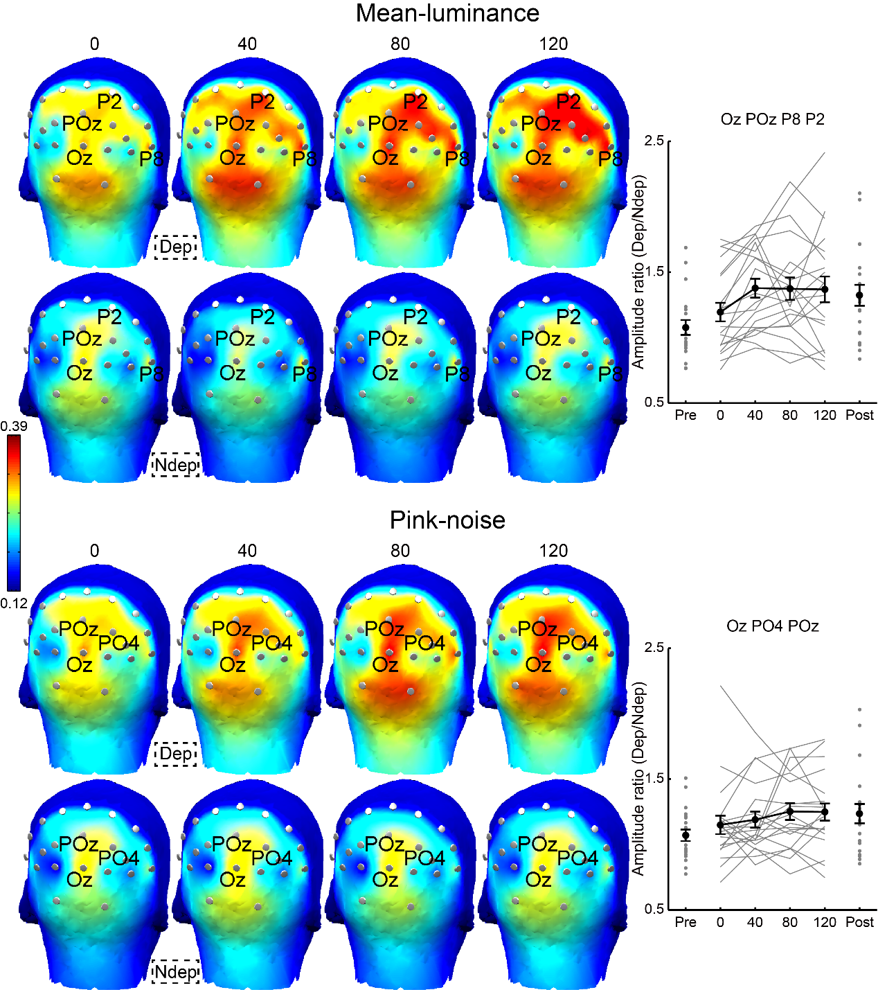 图2 实验二结果图,剥夺眼相比非剥夺眼的振幅比值在后测显著增大,在模拟遮盖剥夺(mean-luminance)条件下振幅比值在剥夺过程中逐渐增大