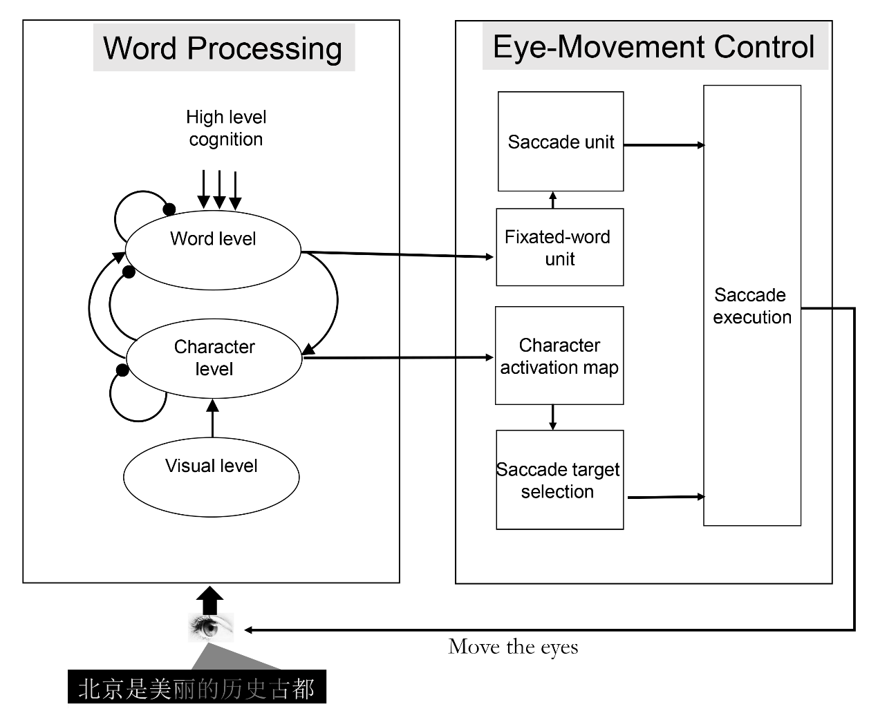 针对眼动控制,CRM采用研究团队提出的基于加工的眼动落点选择策略:在一个注视点,读者尽可能多地加工可以看到的字,然后下一次眼跳落在已经识别的字的后面。这样该模型很好地解释了词汇识别与眼动控制的关系。