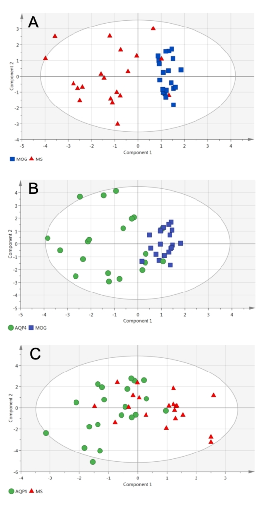 图2 通过正交偏最小二乘模型得出的预测结果:(A)MOG-Ab疾病与多发性硬化症,(B)MOG-Ab疾病与AQP4-Ab疾病,(C)AQP4-Ab疾病与多发性硬化症。