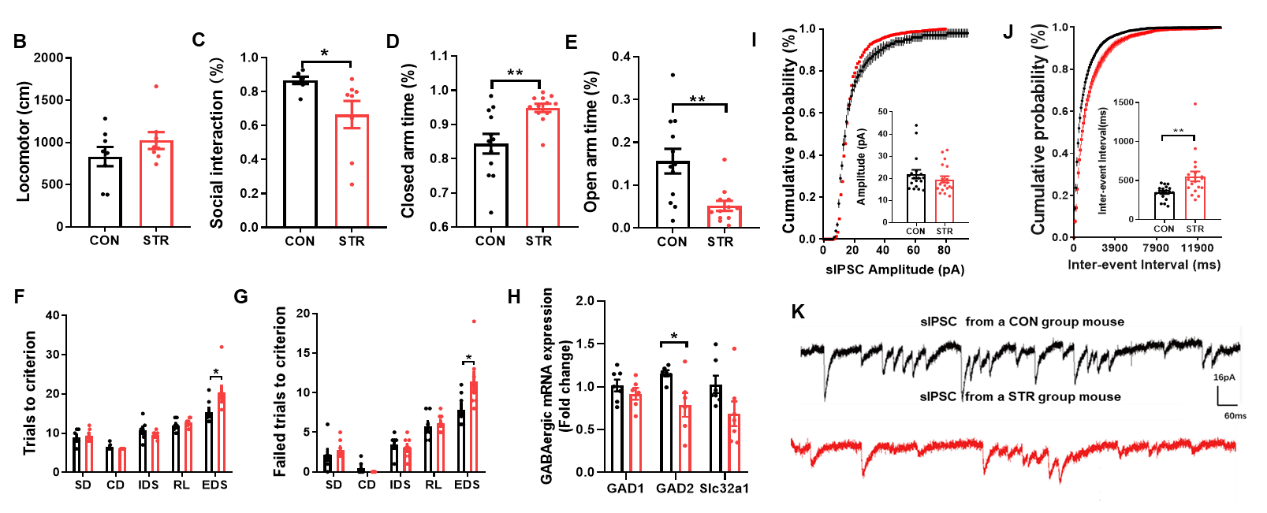 研究主要发现,ASDS导致的成年动物一系列情绪和认知改变,包括社交兴趣降低,焦虑样行为增加和认知转换功能受损,伴随mPFC GABA能抑制性突触传递减弱,表现为自发的抑制性突触后电流(sIPSC)发放平均频率而非振幅显著降低。进一步检测GABA能信号转导分子,发现mPFC GABA合成酶GAD65的mRNA表达水平也显著降低(图一)。这些表明青少期应激导致该脑区的GABA能功能持续抑制。