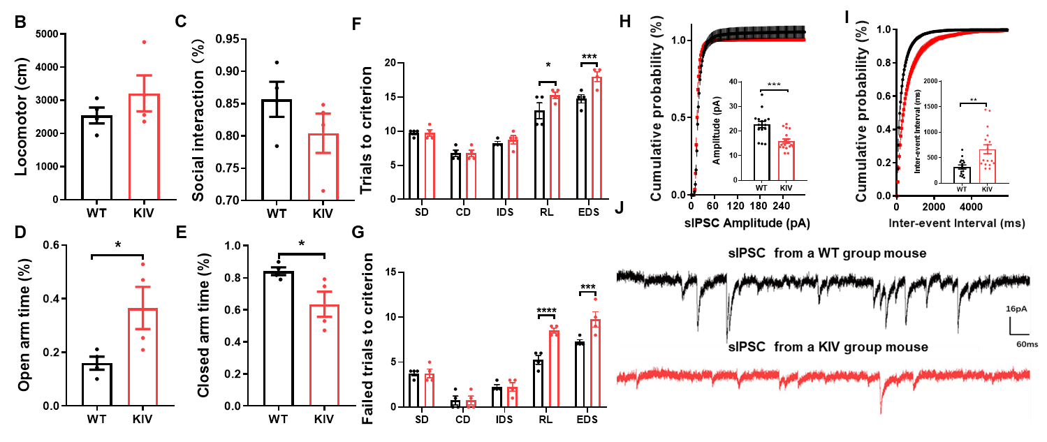 团队前期工作发现,ASDS导致的BDNF下降,主要与BDNF IV启动子转录水平降低有关。因此采用BDNF KIV 转基因动物,发现BDNF启动子IV的特异性敲除可以直接导致以社交兴趣缺失和认知转换功能损害为特征的行为改变,以及mPFC GABA能抑制性突触传递损害,但对焦虑样行为产生相反的影响,表现为在高架十字迷宫开臂的时间增加和闭臂的时间减少(图二),这些结果提示mPFC GABA能突触传递可能是ASS导致的抑郁样行为共病认知功能损伤和BDNF信号转导损害的下游介导途径。