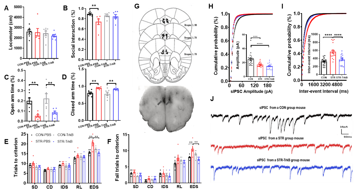 研究人员进一步通过对模型动物mPFC单次急性微注射BDNF TrkB受体激动剂上调BDNF信号通路活动,发现可以快速恢复青少期应激诱导的社交兴趣和认知功能损害,并逆转mPFC GABA能突触传递抑制,但这种改善并不包括焦虑样行为(图三)。