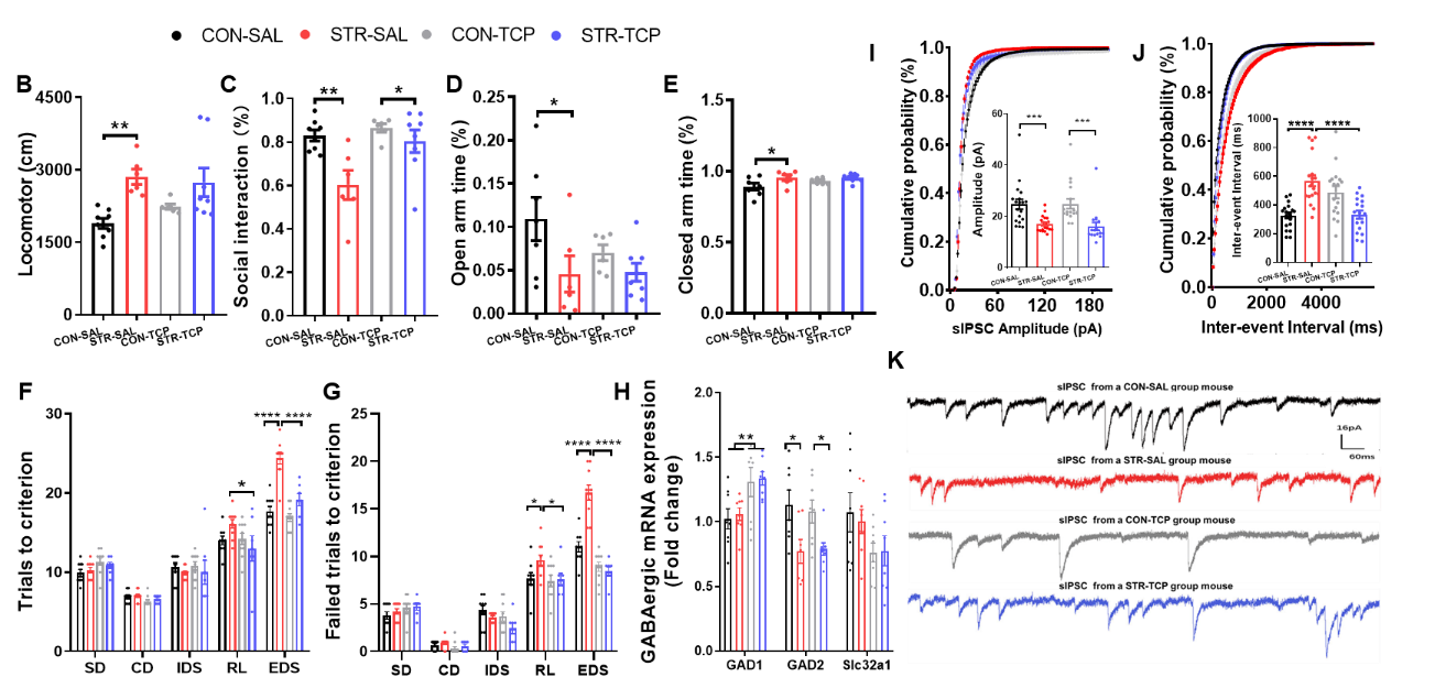 同时,研究人员还采用一种临床使用的抗抑郁药物单胺氧化酶抑制剂(tranylcypromine, TCP),发现成年期慢性抗抑郁治疗也可以改善社交兴趣和认知功能损害,但也对焦虑样行为缺乏改善作用,同时伴随GABA合成酶GAD67的mRNA表达增加,以及应激导致的mPFC GABA能突触传递抑制的恢复(图四)。
