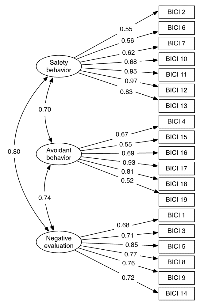 研究结果表明,该量表具有较好的内部一致性(Cronbach α = 0.92)。间隔6个月的重测结果显示重测信度良好(r = 0.73)。因子分析的结果表明,在英美国家中常观察到的单一结构的“体像忧虑”在受测的中国青少年样本中可以分成三个因子:对外貌的负性评价(如“我对自己外表的一些方面不满意”)、回避行为(如“当我的外表达不到令我满意的程度的时候,我不愿意参加社交活动”)和针对感知到的缺陷的安全行为(如“我寻求他人对我外表的肯定”)(见图1)。这种因子结构曾在日本也被观察到,提示“外表焦虑”的结构可能存在东西方文化的差异。