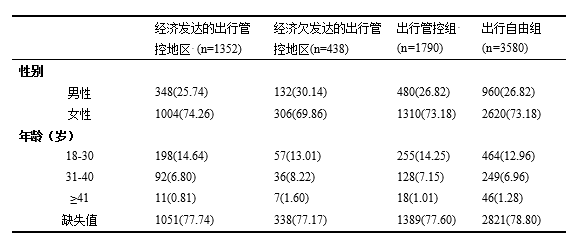 表1. 出行管控组合出行自由组的人口学信息 (N=5379), n (%).