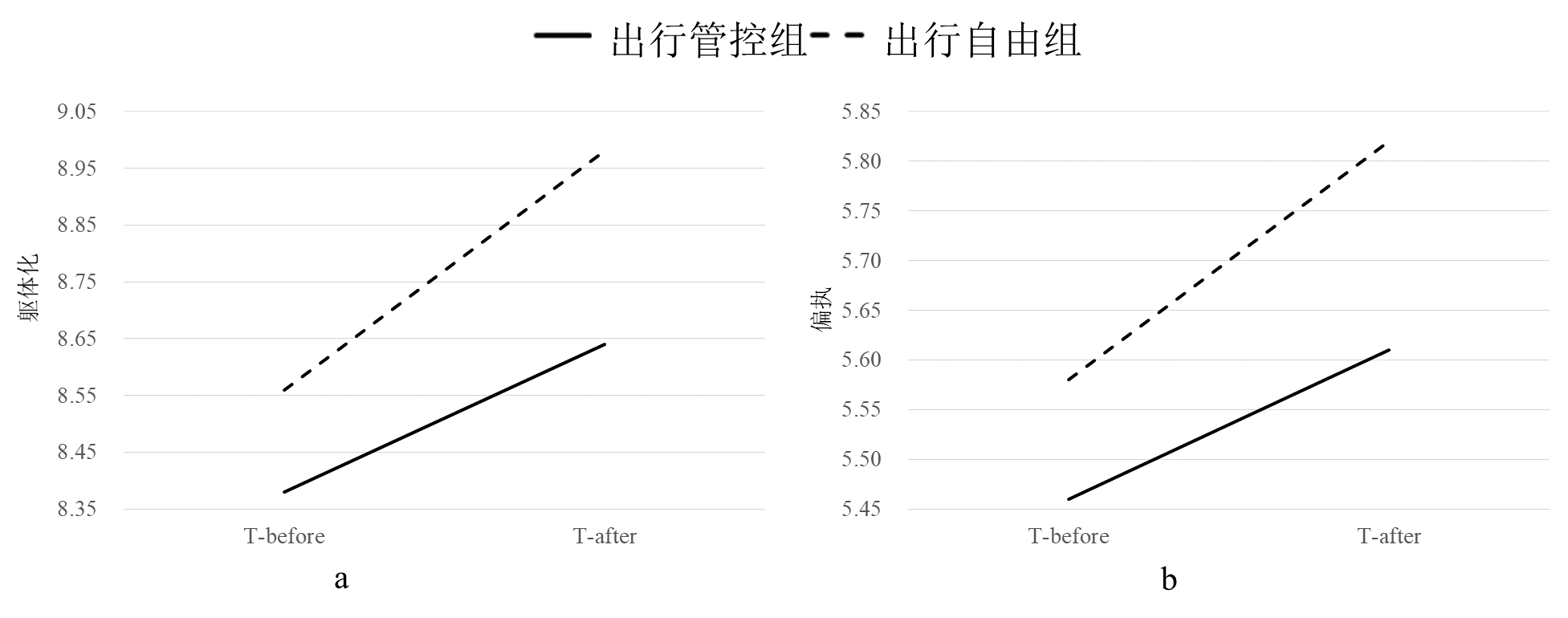 图1 全部样本在(a) 躯体化和 (b) 偏执上体现的时间和出行情况的交互作用
