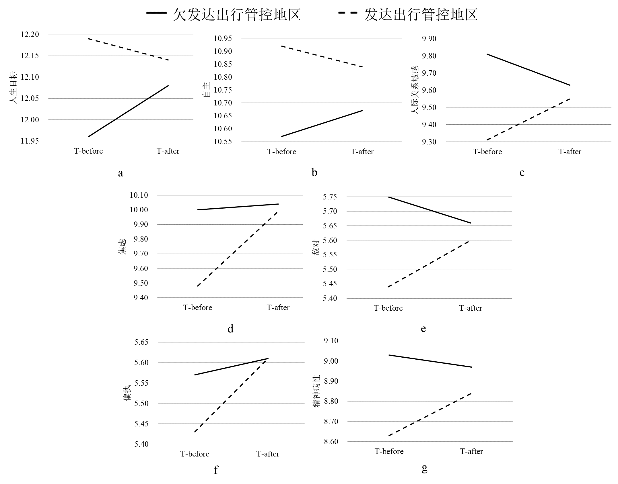 图2 出行管控地区人们在 (a) 人生目标, (b) 自主, (c)人际关系敏感, (d) 焦虑, (e) 敌对, (f) 偏执和 (g) 精神病性上体现的时间和出行情况的交互作用