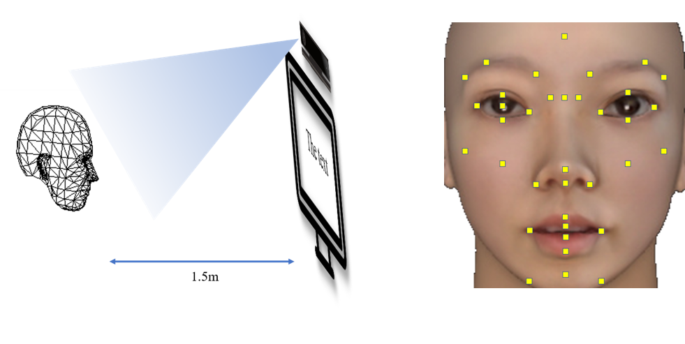 该研究共招募100名被试,被试首先填写了症状自评量表(SCL-90)中的55道题(分别对应人际关系敏感、抑郁、焦虑、敌对、恐怖和精神病性六个维度);然后,阅读一段介绍卢沟桥的中性文本(约44s)。在这期间,研究者使用Kinect摄像机记录下每一帧中被试36个面部关键点的三维坐标,实验场景和36个面部关键点如下图所示。