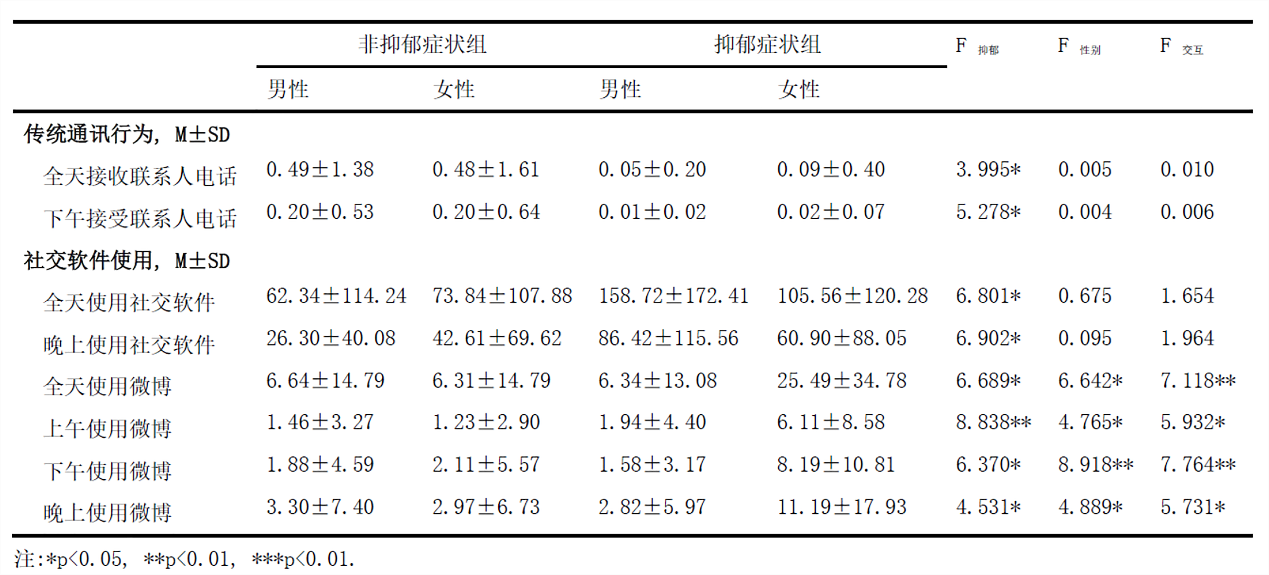 研究分析发现,在传统通讯行为上,抑郁症状组在全天和下午接到联系人电话的频率显著低于非抑郁症状组(F1,116=3.995, P=.048,η2=0.033; F1,116=5.278, P=.02, η2=0.044)。在社交软件使用上,抑郁症状组在全天和晚上使用社交软件的频率显著高于非抑郁症状组(F1,116=6.801, P=.01, η2=0.055; F1,116=6.902, P=.01, η2=0.056)。