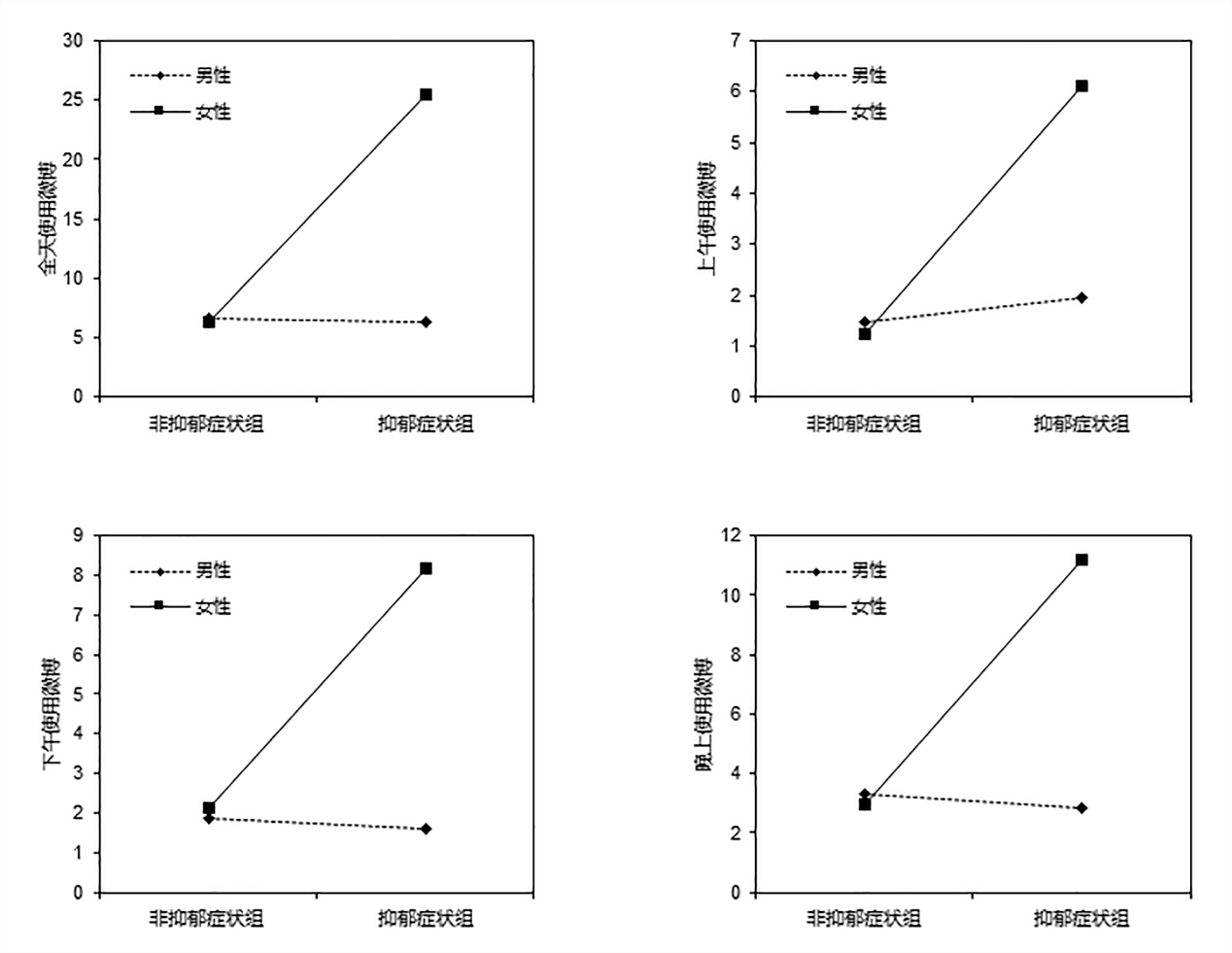对于微博的使用,结果显示无论在一天中的任何时段,抑郁症状的主效应、性别的主效应,以及抑郁症状与性别的交互效应均呈显著相关。简单效应分析显示,抑郁症状组的女性用户的微博使用频率高于男性(全天:F1,116=11.744,P=.001,η2=0.092; 上午:F1,116=9.105,P=.003,η2=0.073; 下午:F1,116=14.224,P<.001,η2=0.109; 晚上:F1,116=9.052,P=.003,η2=0.072)。