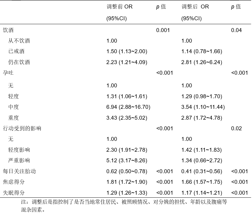 研究结果显示,新冠肺炎疫情集中爆发之后,孕产妇的抑郁发生率为35.4%。在众多临床变量以及人口学变量中,焦虑、失眠、饮酒、孕吐、疫情期间怀孕对行动的影响程度是导致孕产妇抑郁的危险因素。同时,每日关注胎动成为孕产妇抑郁的保护因素。换言之,在怀孕期间每天关注胎动的孕妇,出现抑郁的可能性较小。
