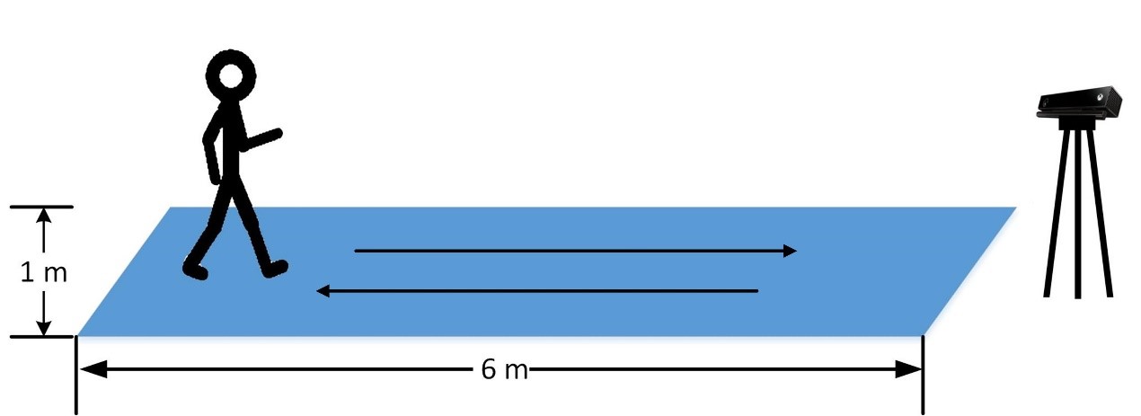 该研究共招募了126名抑郁症患者和121名健康者。病例组为市属某精神卫生医疗机构的抑郁症患者,其诊断结果是由精神科医生根据《精神障碍诊断与统计手册》完成的。对照组是从社会招募的健康人群。所有被试在6米*1米的人行道上自然地来回行走两分钟,放置在一端的Kinect智能体感设备记录下其步态数据(图1)。