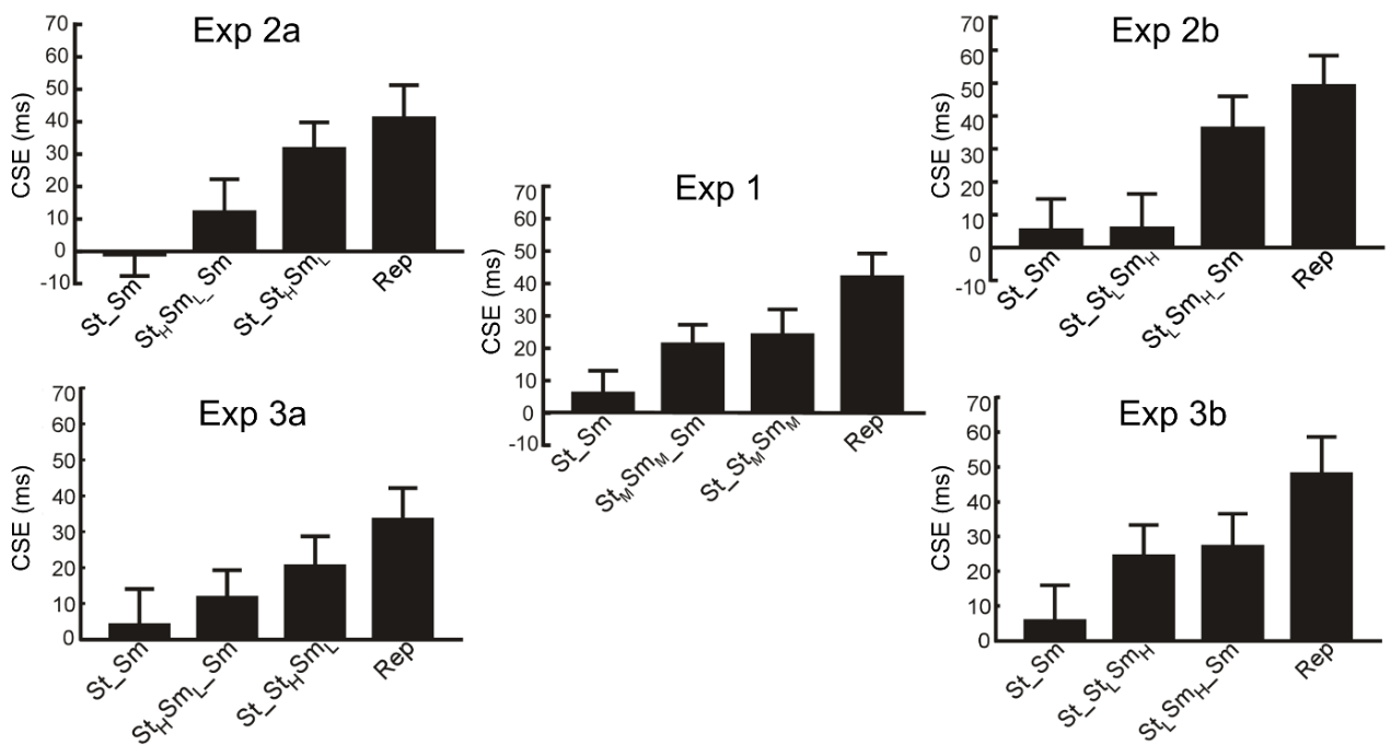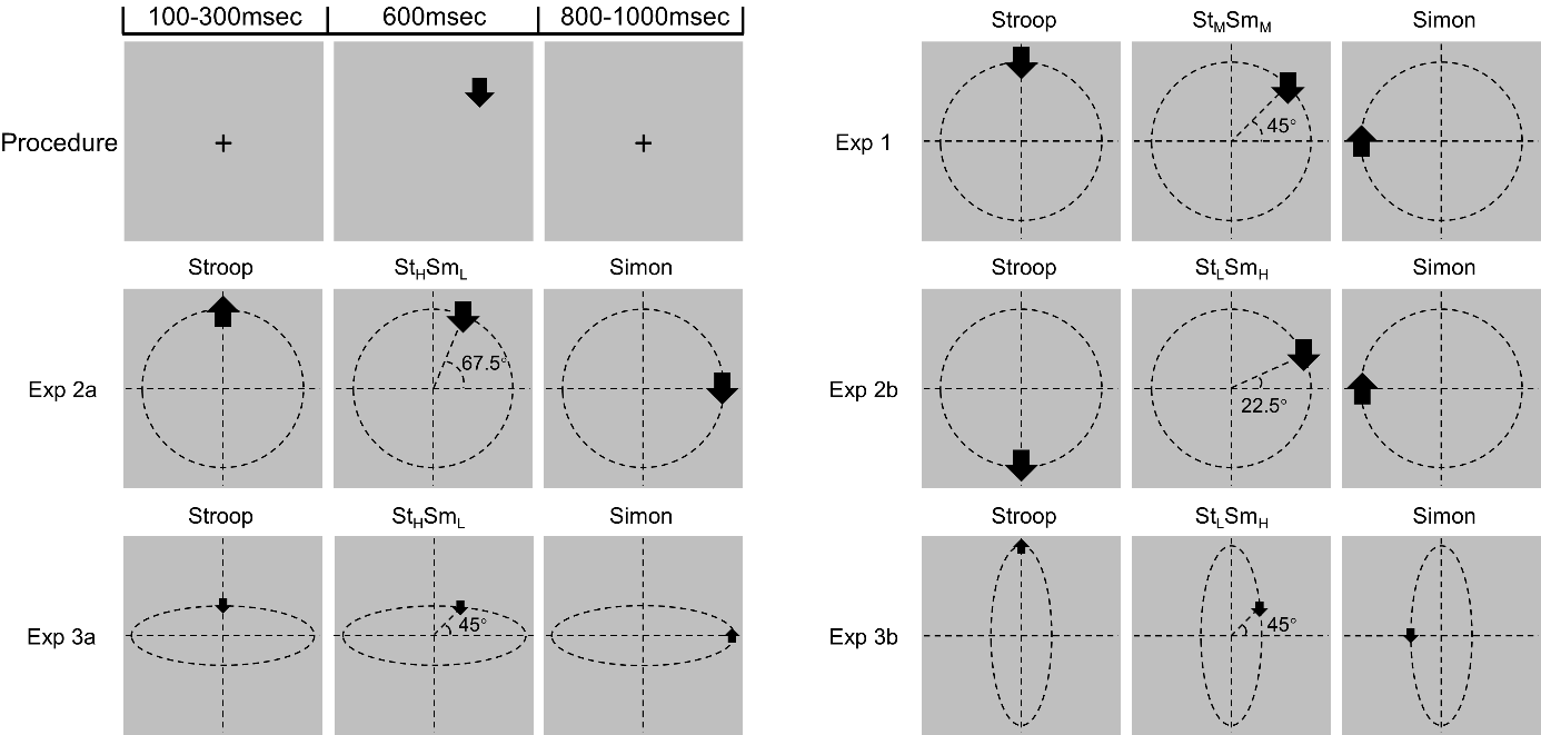 具体而言,研究者利用空间Stroop-Simon任务的正交性,增加了一种中间类型的混合冲突(StSm),这一冲突与Stroop(St)或Simon(Sm) 之间均存在一定的相似性,相似性的大小通过箭头与中心的夹角(实验2a和2b)或箭头与中心的距离(实验3a和3b)来调节。