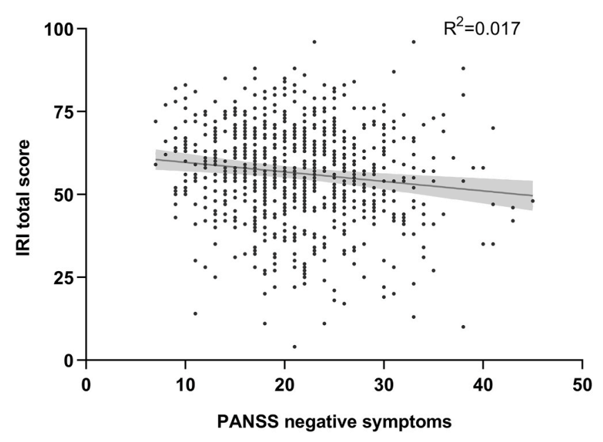 图1. 精神分裂症患者阴性症状与IRI总分呈显著负相关