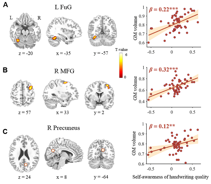 结果发现,人们通常会高估自己的书写质量,而且,男性高估的程度要显著高于女性。脑结构-行为相关分析发现,个体对书写质量的自我估计准确程度与大脑左侧梭状回、右侧额中回和右侧楔前叶三个脑区的灰质体积呈正相关。左侧梭状回和右侧额中回属于书写加工脑网络,在其他领域中并没有报告,可能代表了书写元认知的特异性脑机制,而右侧楔前叶在记忆与知觉元认知研究中也有报告,反映了一种领域一般性的元认知脑机制。