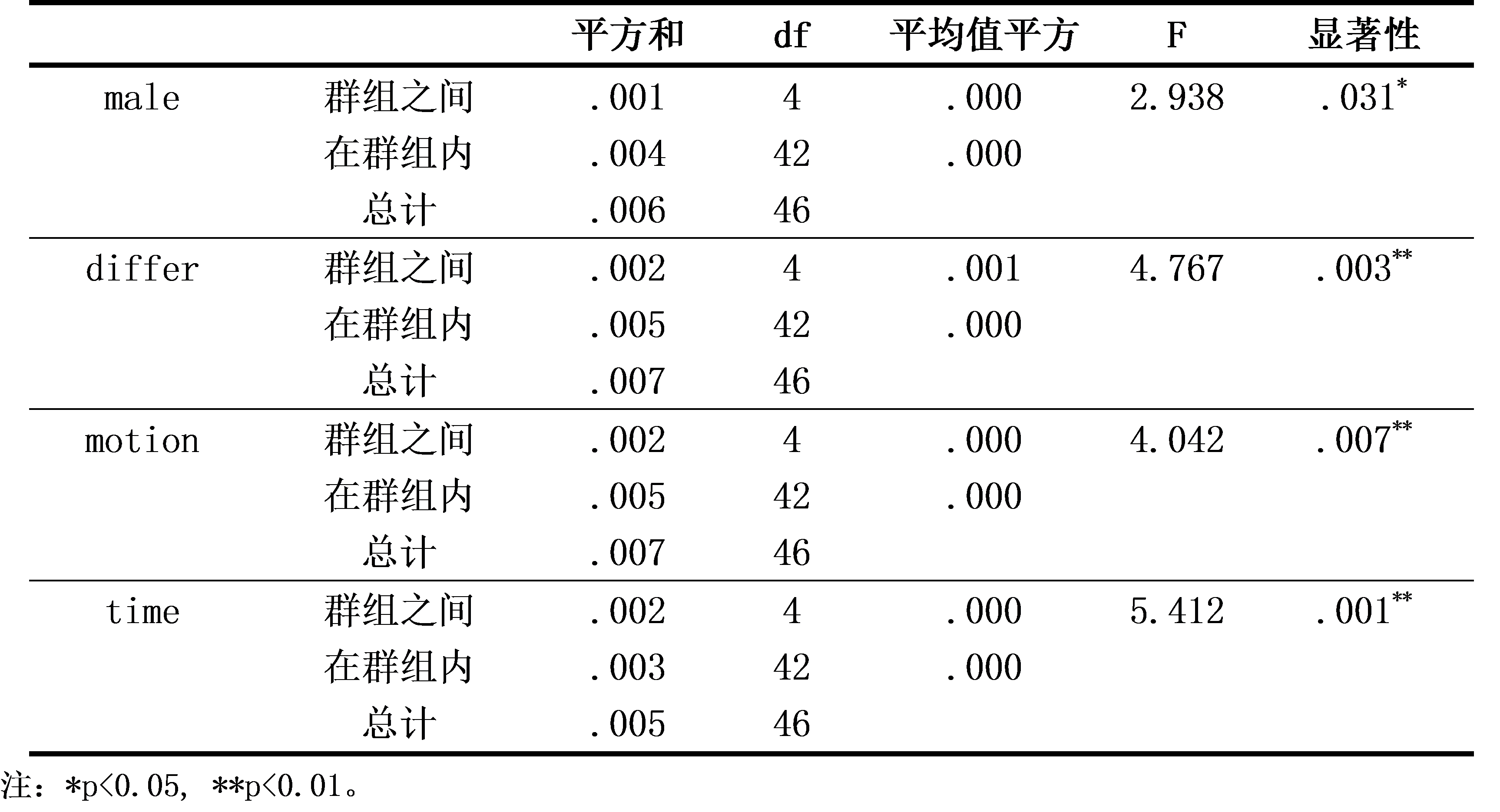 研究采用单因素ANOVA方差分析和事后检验的方法,探究心理词频在不同朝代间是否有差异。研究对37种心理过程词词类进行单因素方差分析,结果发现,其中33种心理过程词无差异,4种心理过程词有差异(表1)。
