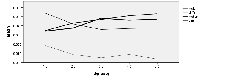 结果还发现,研究资料中的男性词、差异词、移动词和时间词在5个朝代中存在显著性差异(图1)。其中男性词词频和差异词词频呈降低趋势,而移动词词频和时间词词频呈增长趋势。4种词频的变化趋势表明,春秋战国时期、汉和三国两晋南北朝时期是河南历史名人心理语义变迁的转折点。