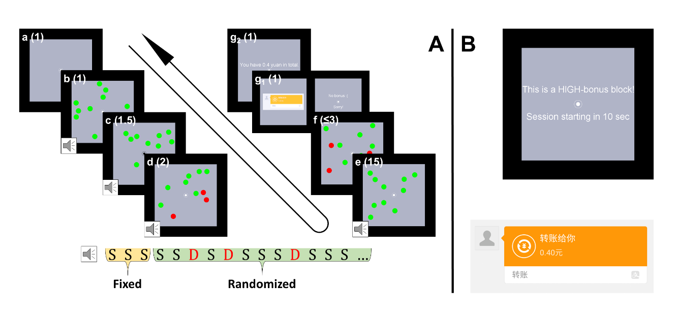 图1:被试在每个block追踪若干小球,根据追踪成绩得到金钱奖励,同时每600毫秒会播放一个纯音作为听觉分心物刺激。在开始阶段目标小球会以红色显示,之后变为绿色以增加追踪难度。根据目标球的个数,分三个追踪难度,低(1个)、中(3个)、高(5个)。Block也分为低奖励和高奖励两种,开始时会告知被试接下来的是哪种block,block结束时屏幕呈现一条转账画面显示奖励的钱数。听觉分心物包含两种纯音,一种是1000Hz的标准音,出现概率为80%;另一种是1500Hz的奇异音,出现概率为20%。实验过程中全程记录脑电信号和瞳孔直径。