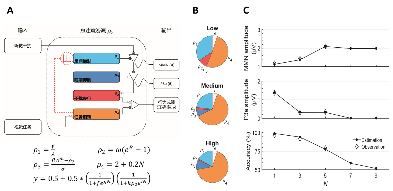 图2:(A)经研究者修正后的Lavie的选择性注意负载理论的简易模型。(B)基于上述模型对Zhang(2006)的研究结果进行模拟,上、中、下图分别对应他们实验的低、中、高注意负载下注意资源的分配情况。扇形图中各颜色所代表的意义与图2A中的颜色设定相同,ε代表固定比例的不可分配的注意资源。(C)该模型不仅很好地拟合了Zhang等(2006)的研究结果(注意负载N = 1, 3, 5),并且预测若其任务的注意负载进一步增大(N = 7, 9),将得到与本研究类似的结果,尤其是MMN幅度会开始回落。注:这里N为7、9并非表示具体的追踪7或9个小球,而是通过数值抽象地表示比追踪5个小球时更高的注意负载水平。