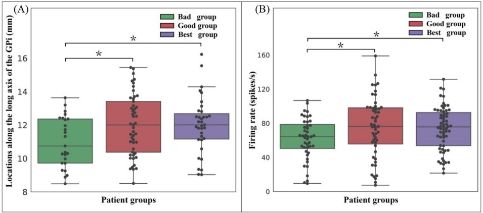 中国科学院心理健康重点实验室王亮研究组与合作者基于双侧GPi-DBS MS患者群体上的研究发现,同治疗效果差的患者组相比,治疗效果较好和最好的患者组其DBS刺激靶点位于内侧苍白球的后腹侧(图1-A),其DBS靶区附近神经元的平均发放率更高(图1-B)。该研究表明,在MS治疗中,内侧苍白球后腹侧电刺激可能有更好的治疗效果,较高的神经元动作电位可作为生物标记物指导手术过程中的DBS电极靶点选择。