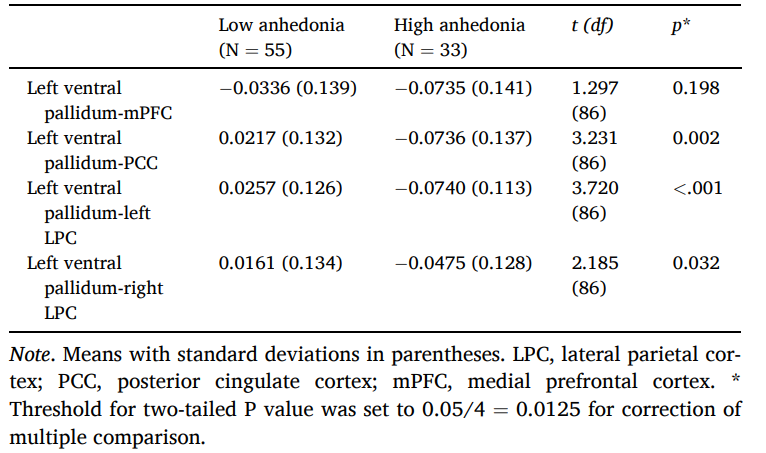 全脑分析的结果显示,在控制了性别、年龄和其他PTSD症状水平后,高PTSD快感缺失症状水平的个体相较于低快感缺失症状的个体,大脑左半球腹侧苍白球与双侧后扣带回/楔前叶区域的功能连接水平更低(图1)。