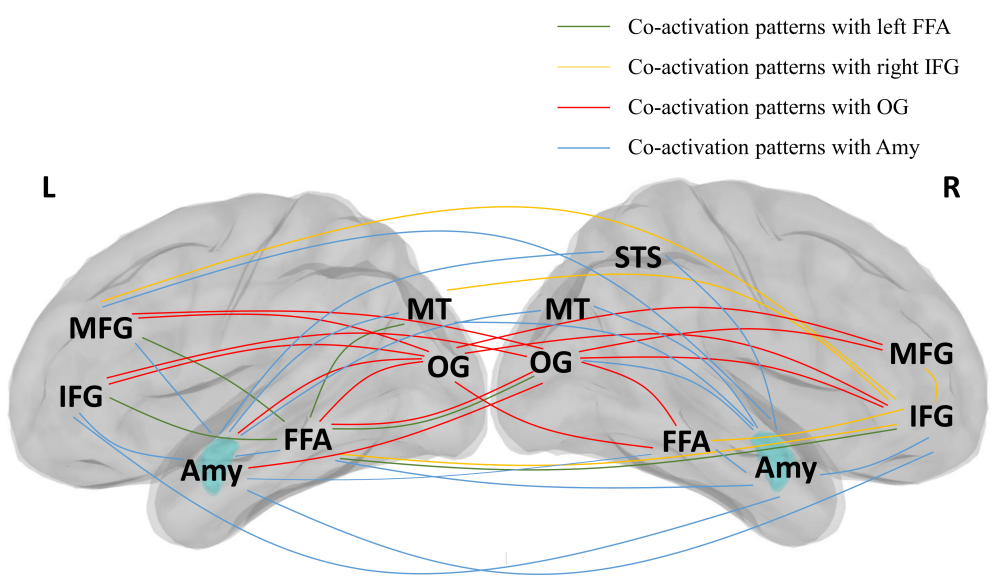通过表情与中性面孔对比,结果显示腹侧通路而非背侧通路负责表情加工;通过外显、内隐、被动观看三种实验任务的对比,结果发现左侧梭状回面孔区负责自下而上的表情加工;通过动态和静态表情加工对比,腹侧和背侧通路在动态表情加工中都有更强激活。基于表情加工的兴趣区域,该研究也结合功能连接分析方法(MACM)重构了面部表情加工的大脑网络(见图1)。