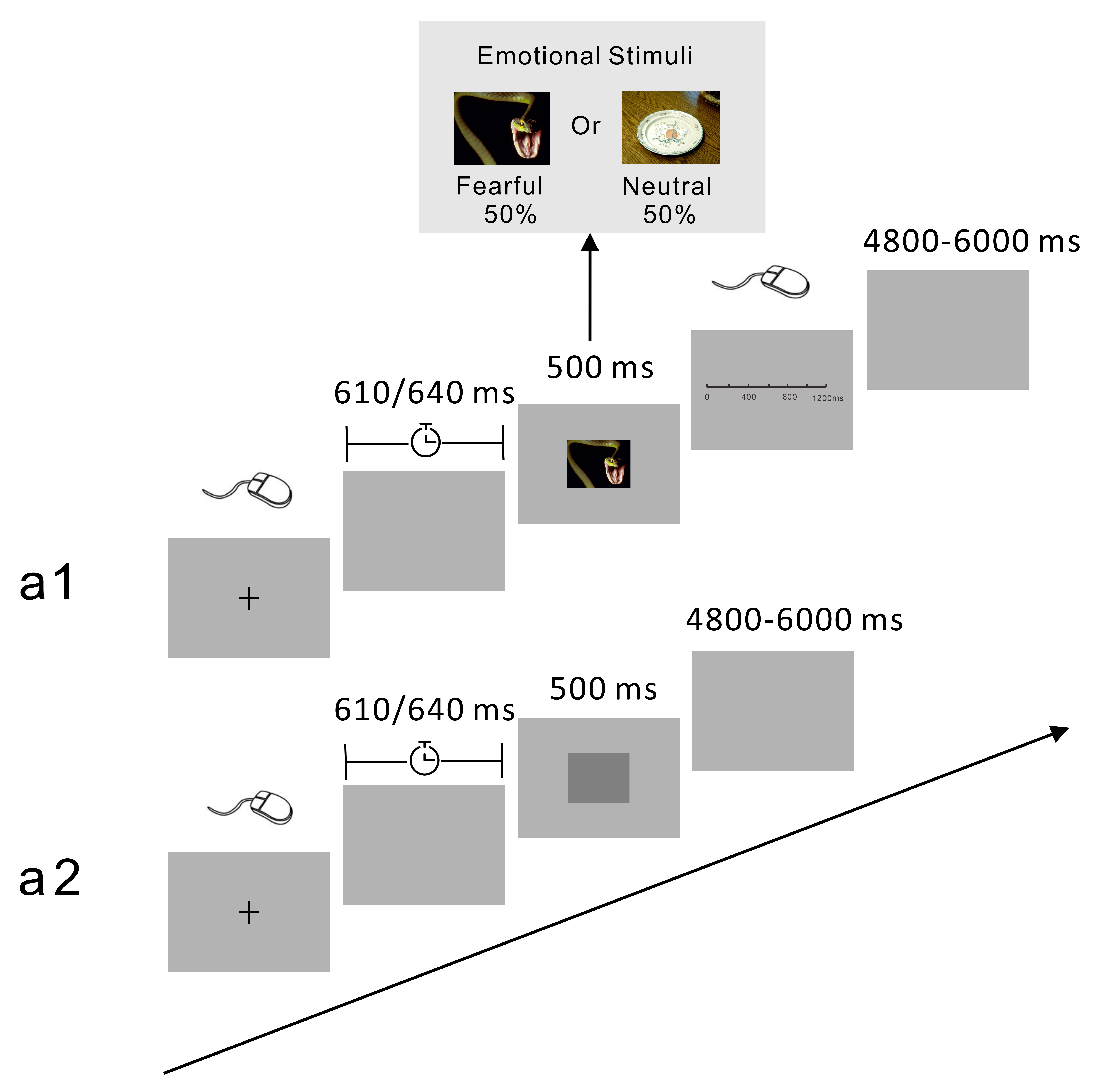 脑与认知科学国家重点实验室傅小兰研究组在最新一项研究中,通过脑电技术探讨了不可预期恐惧情绪刺激对于时间知觉的调节作用及其神经机制。该研究采用情绪刺激类型(恐惧、中性)×预期性(可预期、不可预期)两因素混合设计,被试任务是估计间隔时间 (图1)。行为结果表明,不可预期的恐惧图片相比其他条件产生了最强的时间压缩效应。