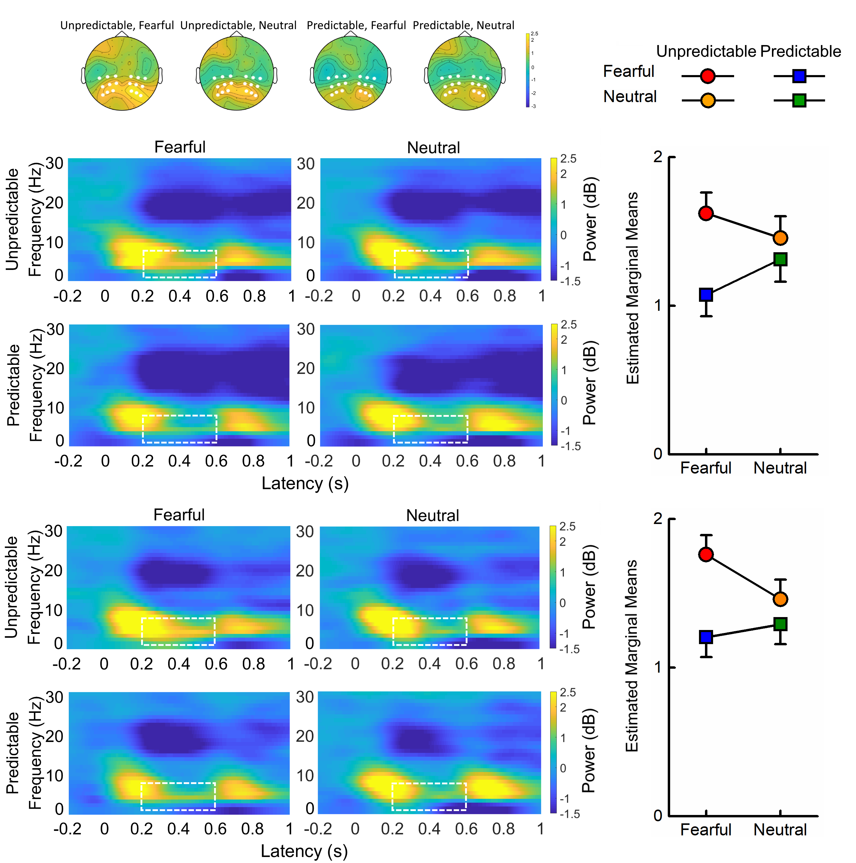 时频结果表明,在LPP的时间窗口(200-600毫秒),不可预期的恐惧图片诱发了最大的delta-theta节律能量,这种节律和行为的时间压缩量存在负性关联(图3)。进一步证实了不可预期的恐惧刺激干扰了时间加工的记忆阶段,造成了主观时间的压缩。