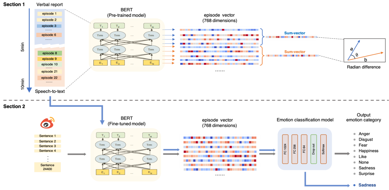 Section 2: 基于24400个微博句子训练情绪识别模型,该模型在8类情绪识别任务中准确率达到了78%。将出声汇报的内容输入该情绪分类器中以量化报告的悲伤想法的程度
