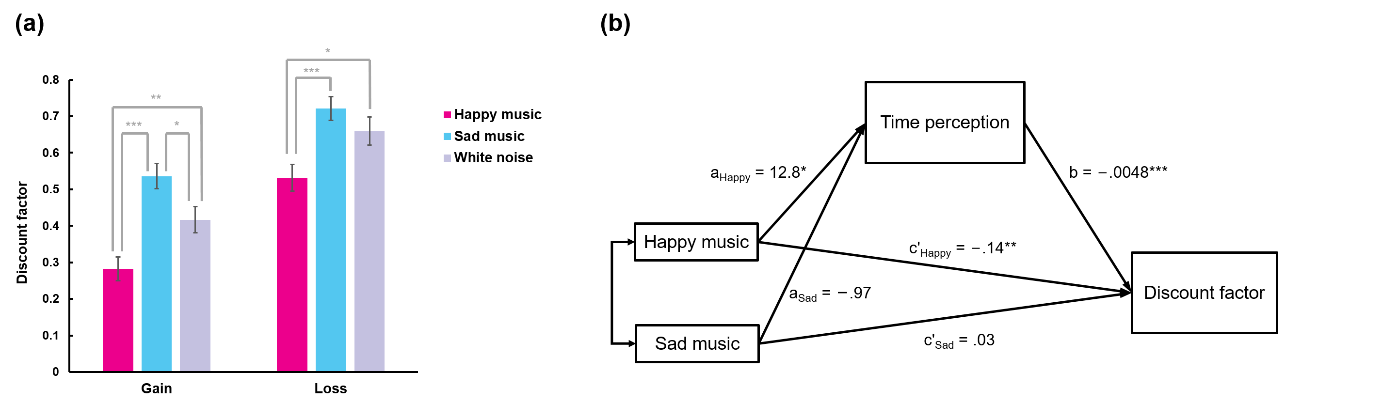 图1. 实验1结果:(a)音乐情绪对金钱收益和金钱损失条件下跨期决策折扣因子的影响。折扣因子越大,代表被试越倾向于选择LL。(b)在金钱收益条件下,时间(差异)知觉的中介作用显著。* p < .05; ** p < .01; *** p < .001.