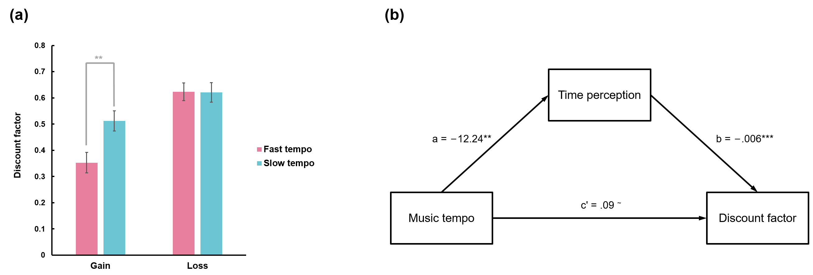 图2. 实验2结果:(a)音乐速度对金钱收益和金钱损失条件下跨期决策折扣因子的影响。折扣因子越大,代表被试越倾向于选择LL。(b)在金钱收益条件下,时间知觉的中介作用显著。~p < .1; ** p < .01; *** p < .001.